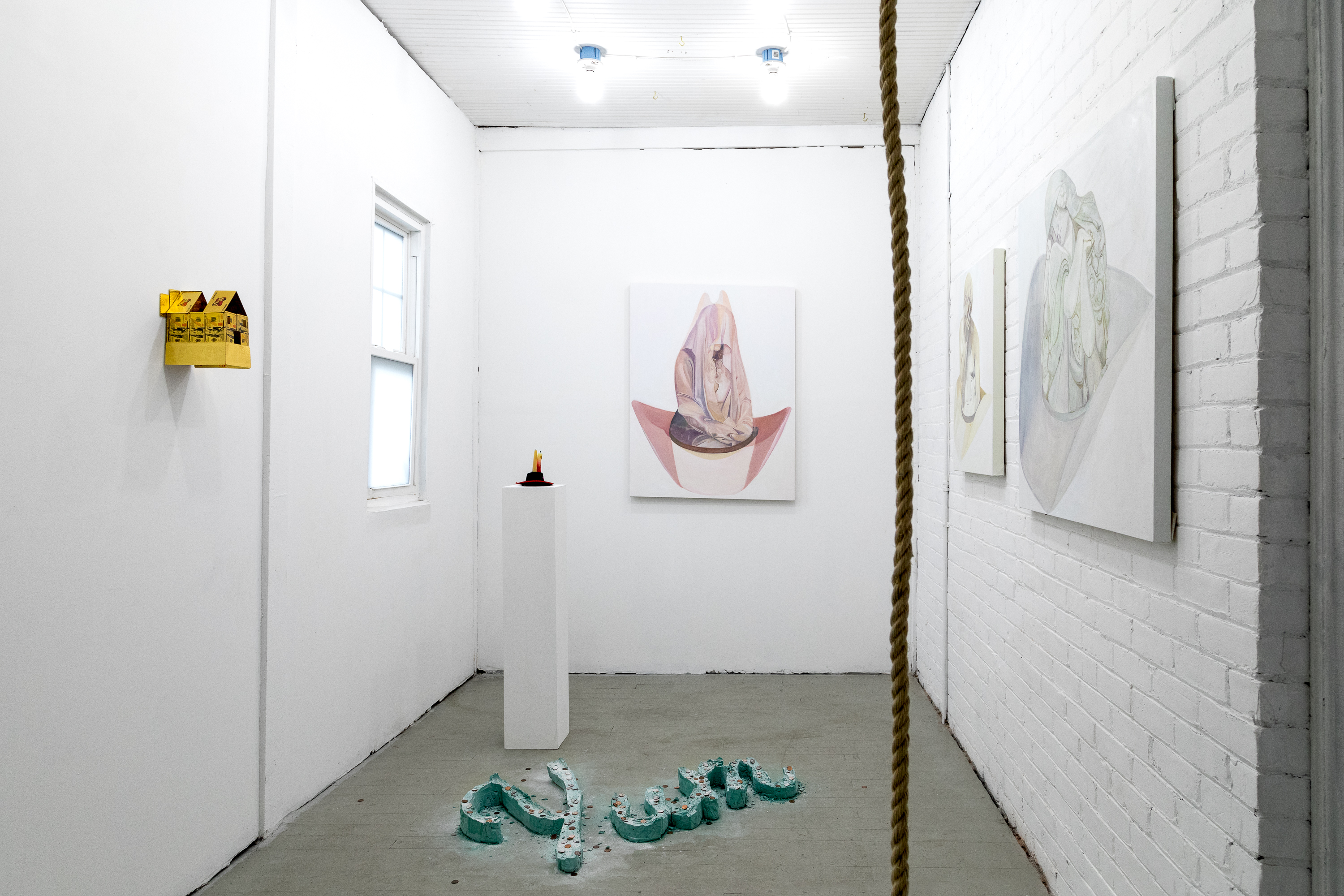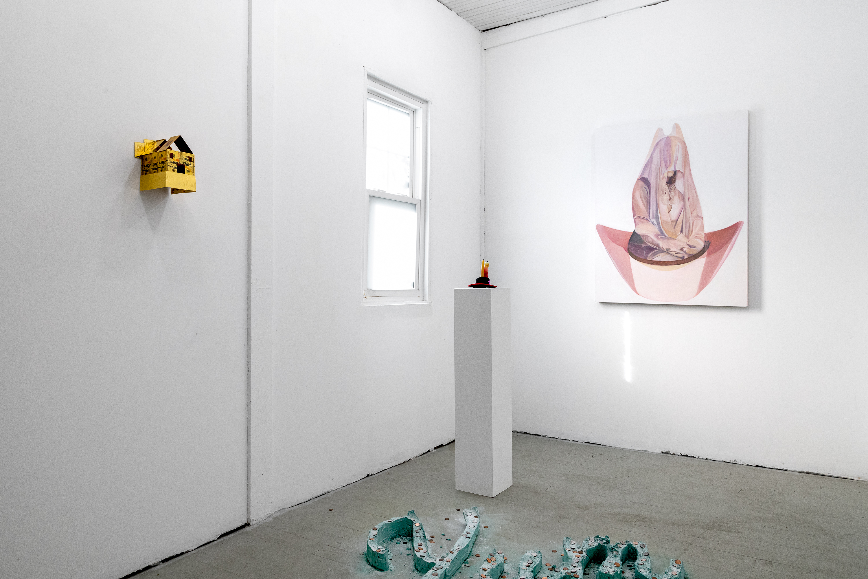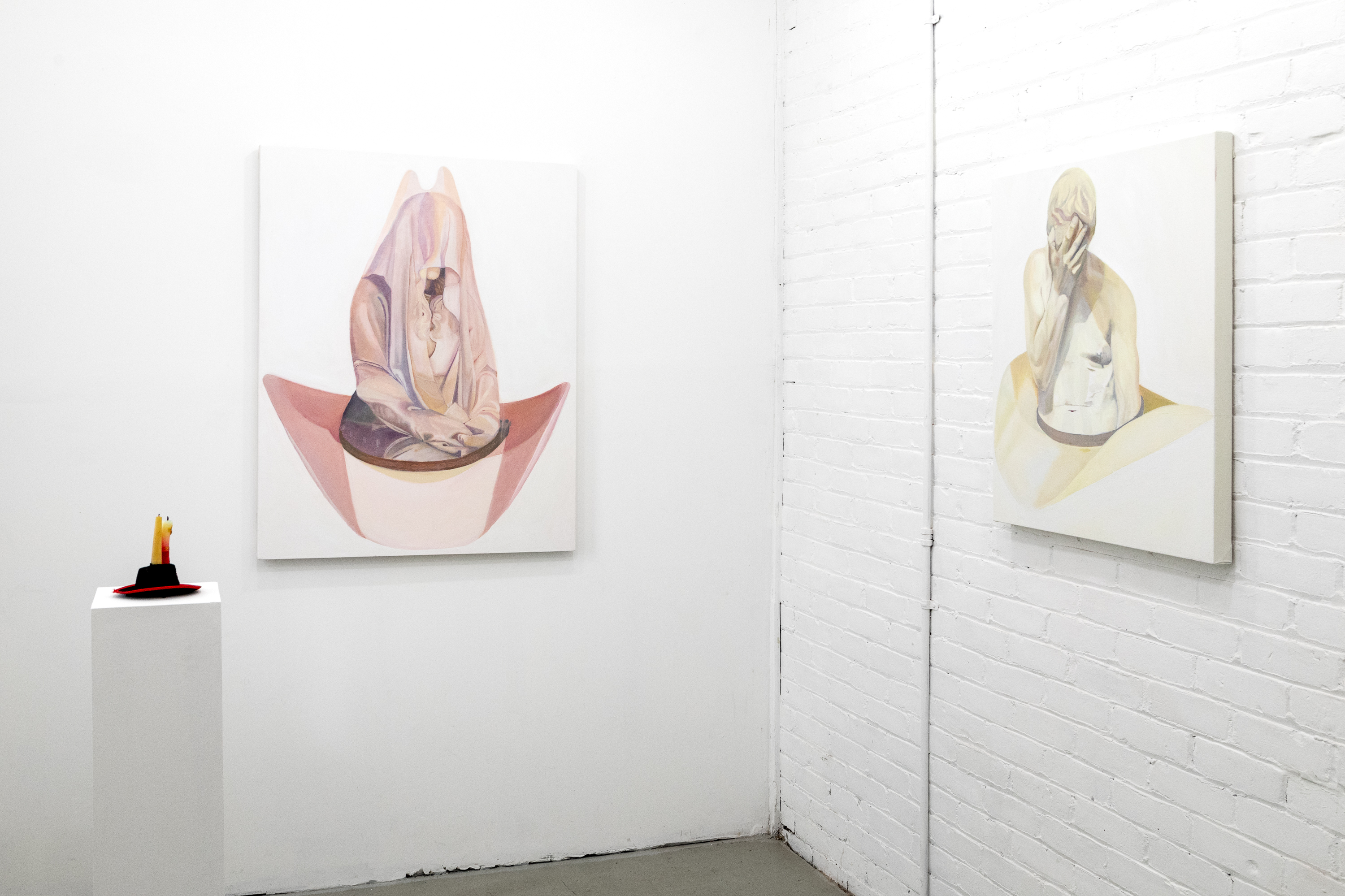 The exhibition brings together two artists who share a common studio and engage in dialogue but have very distinct approaches to art-making. Mary Kate presents assemblage sculptures composed of flimsy, mass-produced material that make disconnected references to aspirational wealth to create sculptures in the form of misfunctional objects and dioramas. Ashley Cook creates oil paintings that pull from the drama of expressive historical sculpture, reinterpreted into dreamlike compositions washed in pale pastels. Her figures appear suspended in meditative calm, yet carry an undertow of unsettling surrealism.