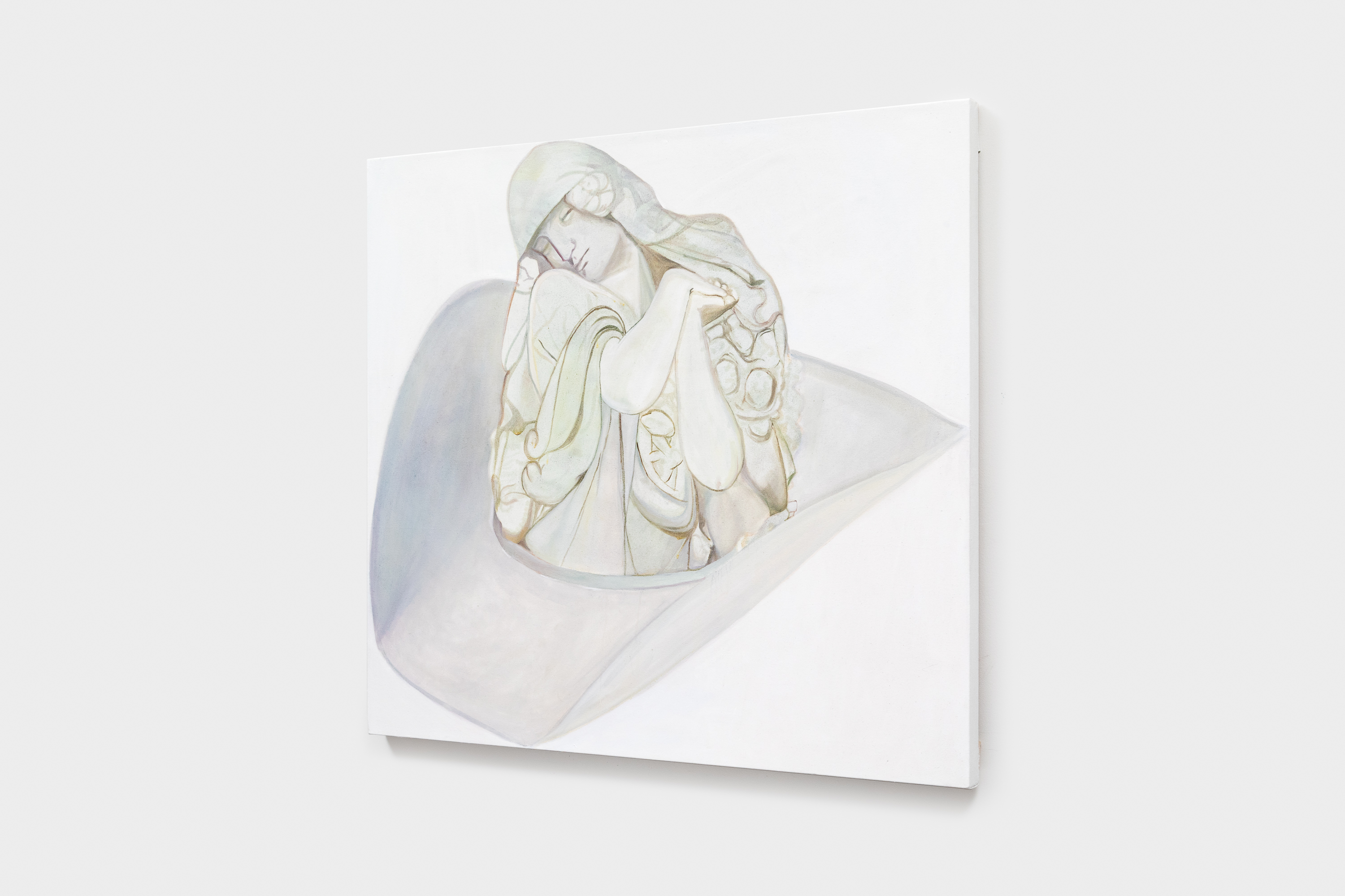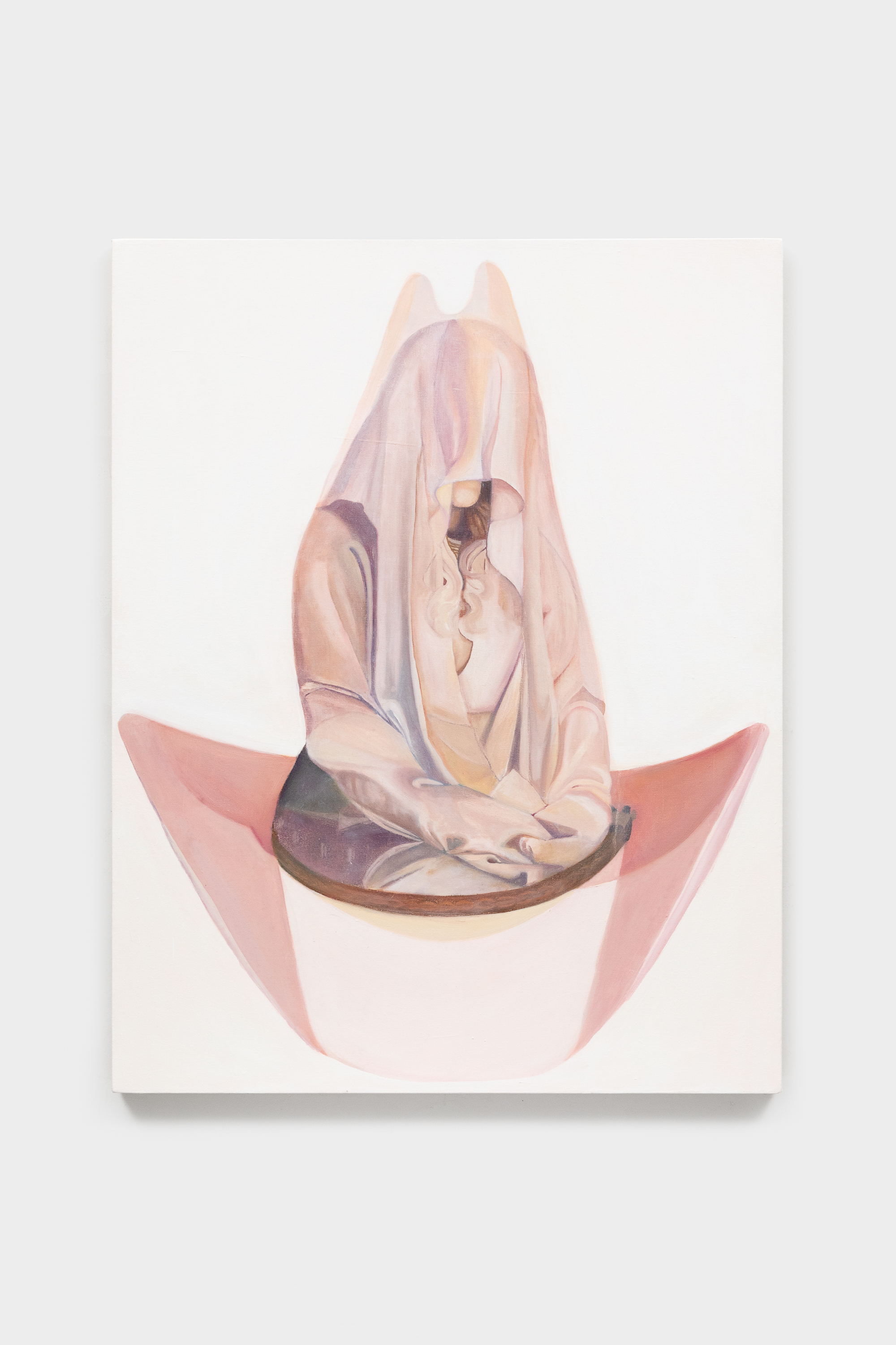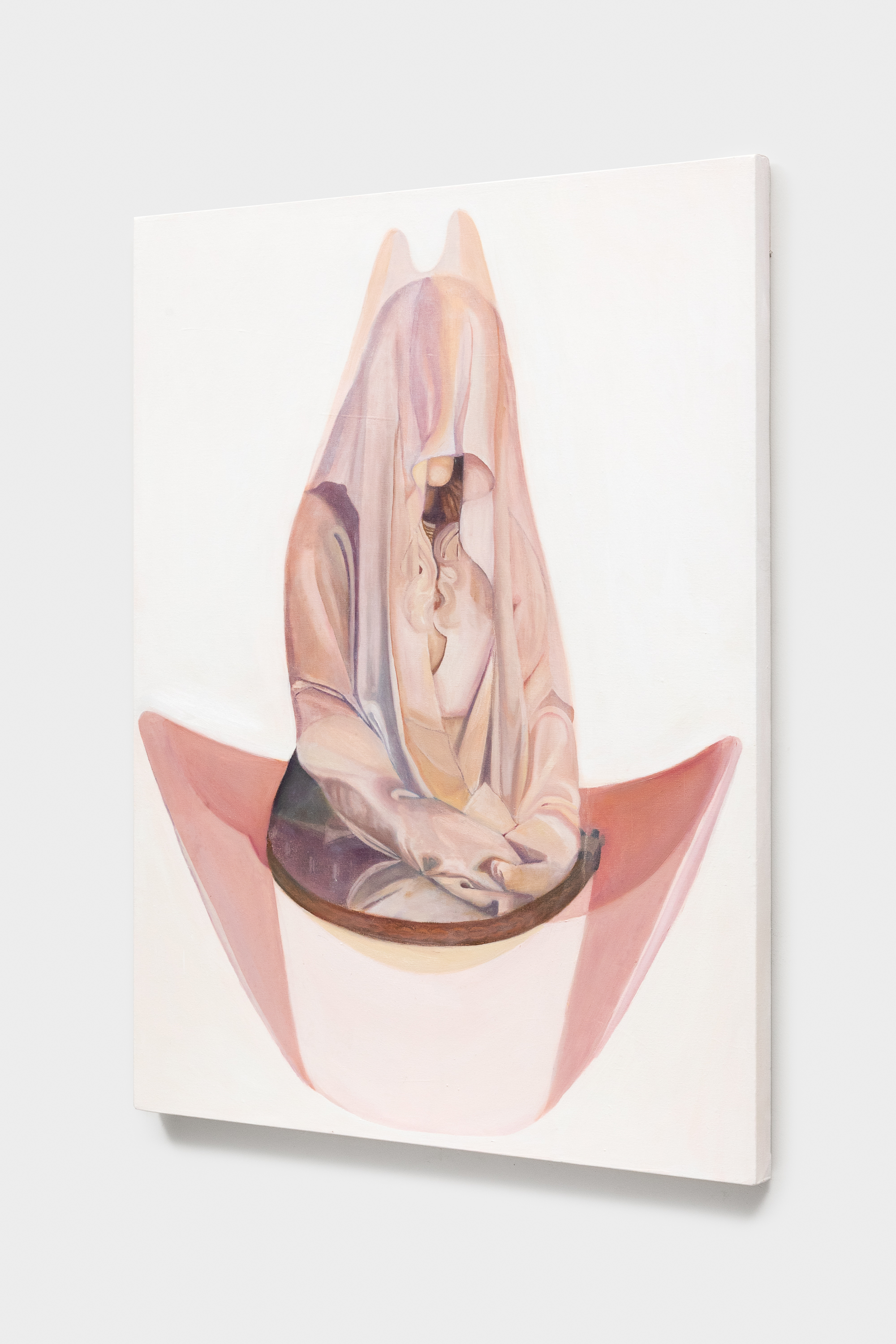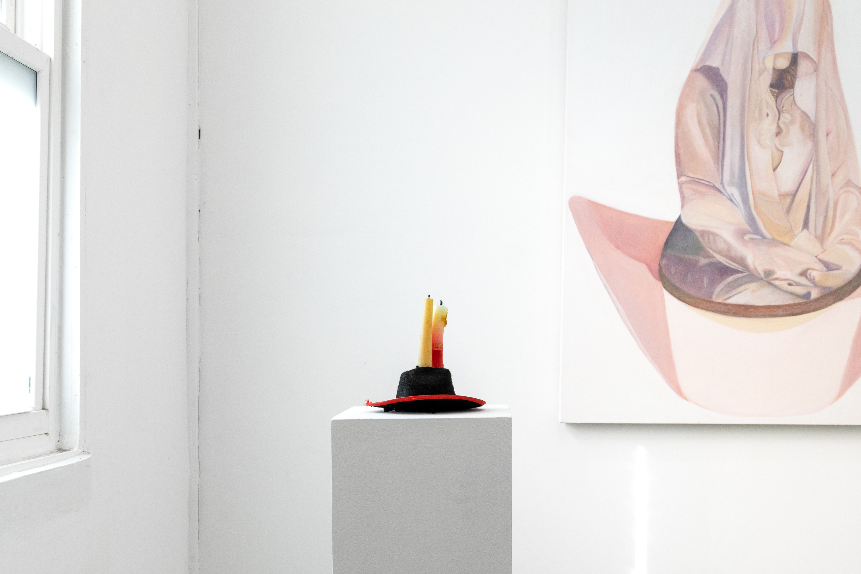 The exhibition brings together two artists who share a common studio and engage in dialogue but have very distinct approaches to art-making. Mary Kate presents assemblage sculptures composed of flimsy, mass-produced material that make disconnected references to aspirational wealth to create sculptures in the form of misfunctional objects and dioramas. Ashley Cook creates oil paintings that pull from the drama of expressive historical sculpture, reinterpreted into dreamlike compositions washed in pale pastels. Her figures appear suspended in meditative calm, yet carry an undertow of unsettling surrealism.